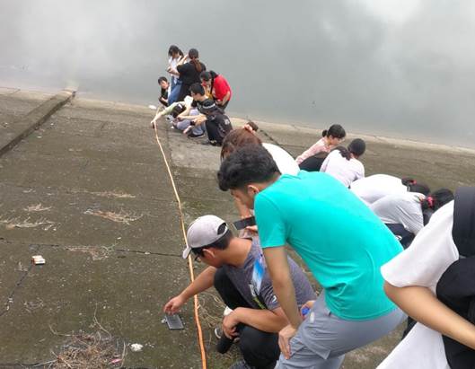 第一大组的同学在田培老师的指导下,对该水库的基本情况进行简单了解,并通过数据测量对三峡水库与该水库进行对比分析。田培老师将水库实习的任务落实到每一个小组,并亲自指导各个小组对水库数据的测定,对同学实时提出来的问题进行回答。