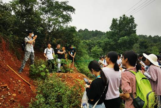 第二大组的同学步行前往水库后方的山体红壤区域。在易军老师的指导下,同学们对一块出露地表的土面进行挖掘以及毛面的处理,逐步完成了红壤剖面的工作。按照之前学习到的对原有土壤剖面测量知识,同学们熟练的进行了剖面结构的划分,也顺利完成了土壤各种性质的数据收集工作。伍铁牛老师指出该地区的土壤中石块很多且磨圆度很好,进而推出该地区成土母质应该是沉积物,形成时期在晚更新世的早期,追溯历史,可能与长江三峡贯通形成有一定的关系。
